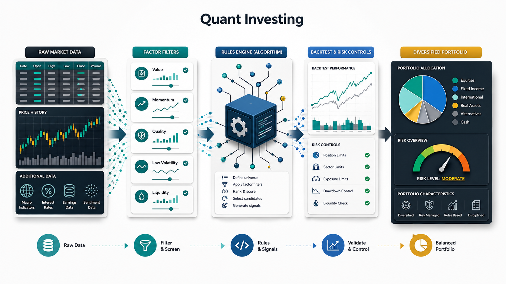 퀀트 투자의 뜻, 전통적인 투자와의 차이, 팩터 투자, 백테스트, 리밸런싱, 리스크 관리, 초보자가 주의할 점까지 정리합니다.